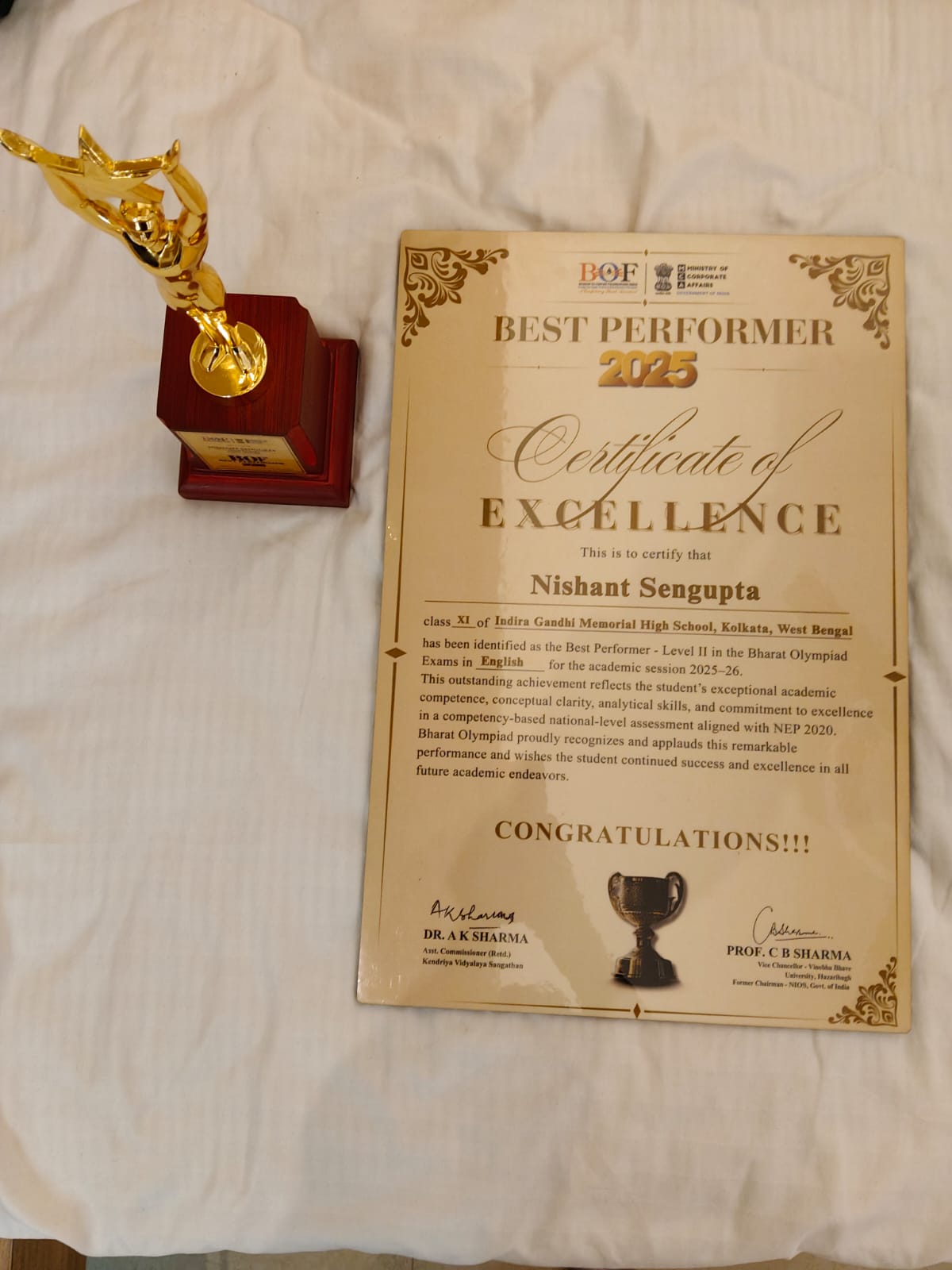 Nishant Sengupta Xl Com B of IGMHS Dum Dum was awarded National Toppers Rank for his brilliant performance in English in BOF Olympiad. The Award Ceremony was held at Bhubaneswar on Saturday, the 14th February 2026 at Geeta Govind Sadan.